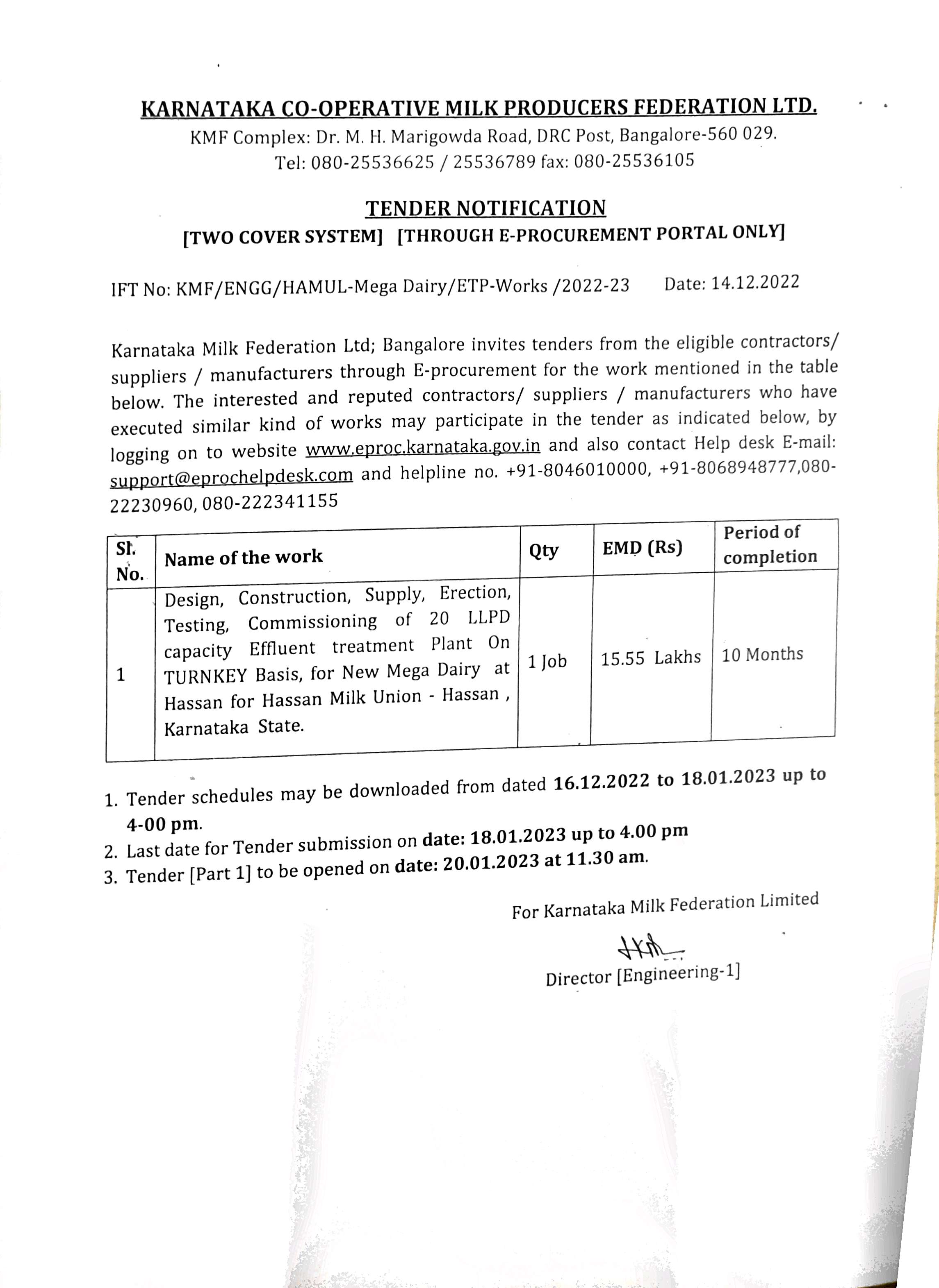 Description:DESIGN, CONSTRUCTION, SUPPLY, ERECTION, TESTING, COMMISSIONING OF LLPD CAPACITY EFFLUENT TREATMENT PLANT ON TURNKEY BASIS, FOR NEW MEGA DAIRY AT HASSAN FOR HASSAN MILK UNION- HASSAN, KARNATAKA STATE.