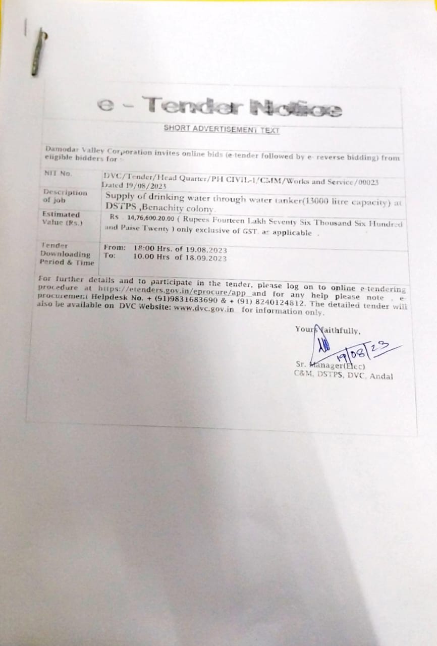 SUPPLY OF DRINKING WATER THROUGH WATER TANKER ETC.