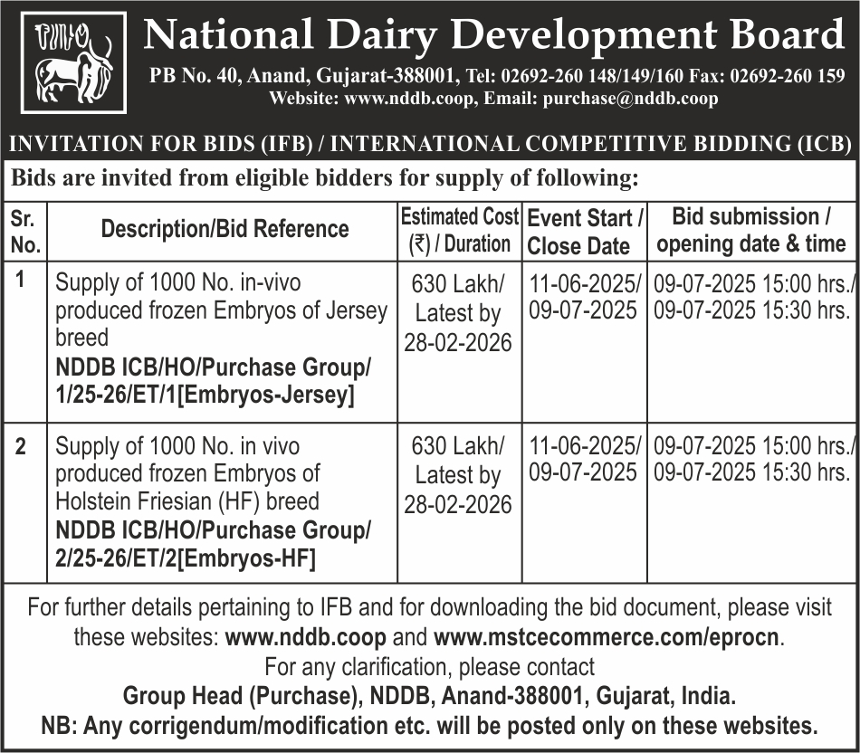 “Import of 1000 No. Frozen Embryos of each Jersey and HF Breed” under Rashtriya Gokul Mission (RGM) Scheme of Government of India.