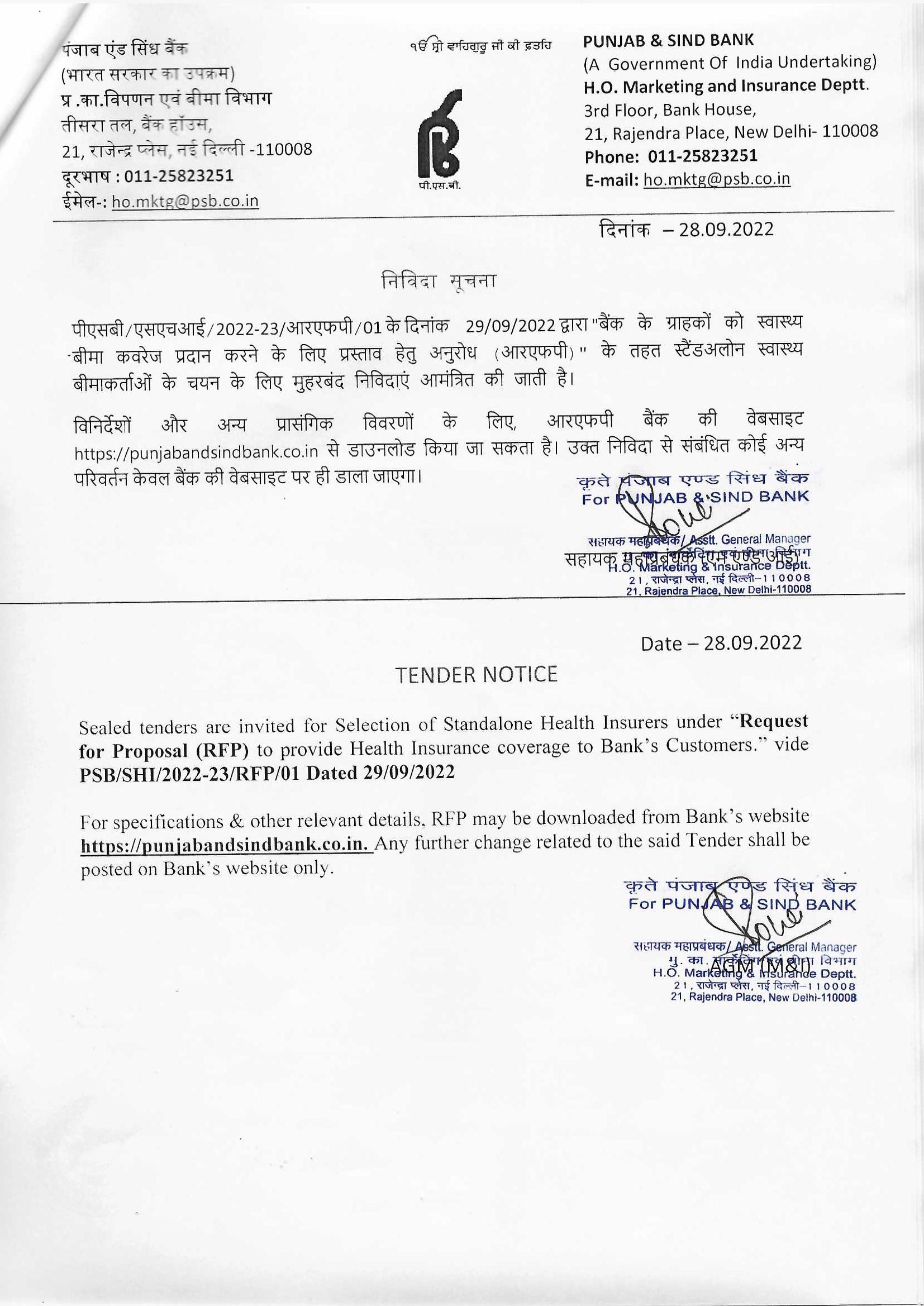 RFP For Selection of Standalone Health Insurers to provide Health Insurance coverage to Bank’s Customers RFP NO. PSB/SHI/2022-23/RFP/01 dated 29/09/2022