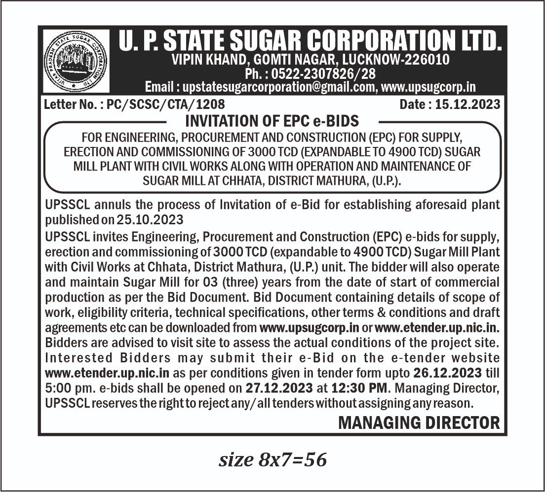Description: Engineering, Procurement and Construction (EPC) for Supply, Erection and Commissioning of 3000 TCD (expandable to 4900 TCD) Sugar Mill Plant with Civil Works along with Operation and Maintenance of Sugar Mill at Chhata, District Mathura, (U.P.)