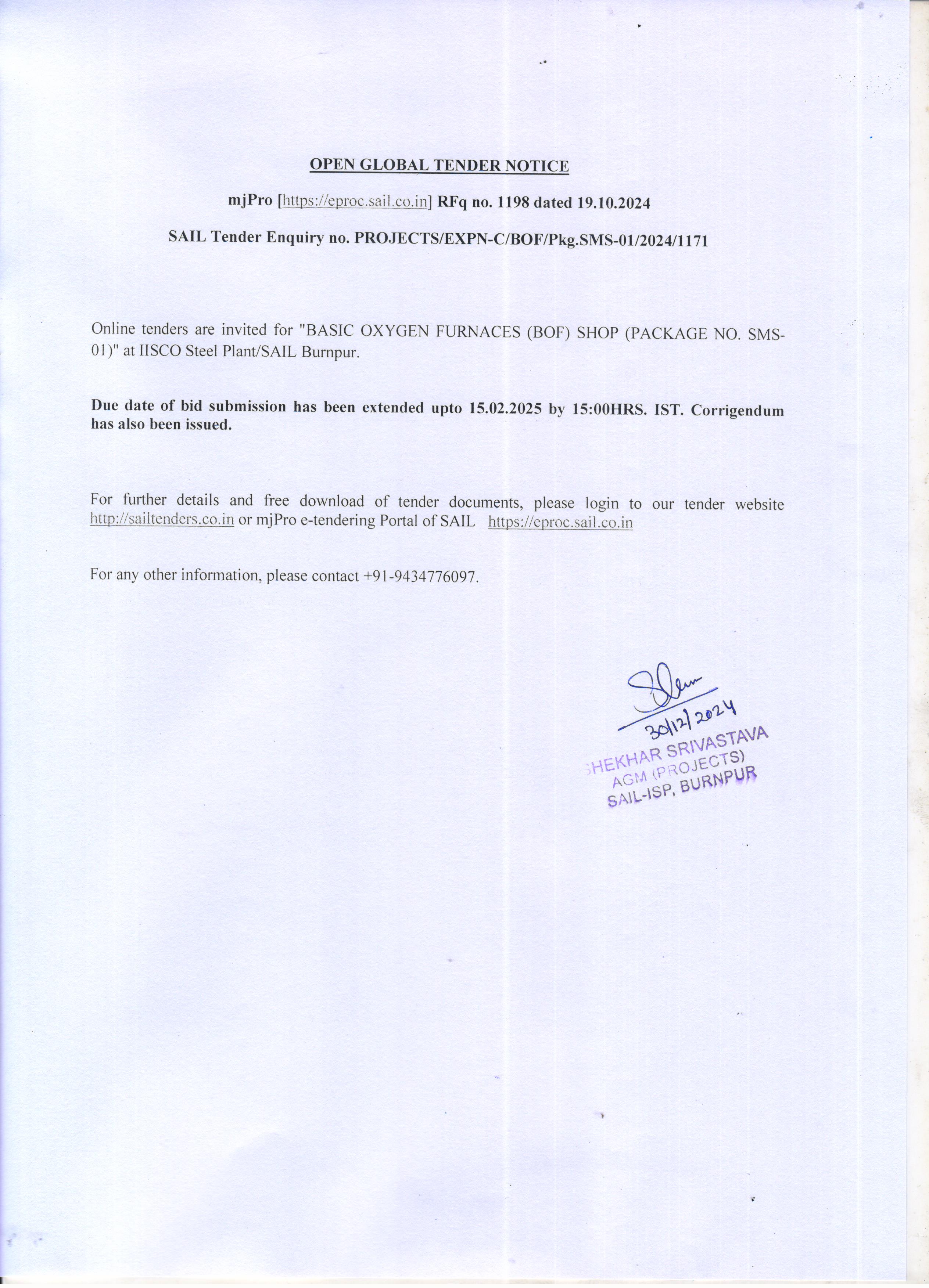 CORRIGENDUM-(“BASIC OXYGEN FURNACES (BOF) SHOP (PACKAGE NO. SMS-01)" at SAIL-ISP Burnpur).