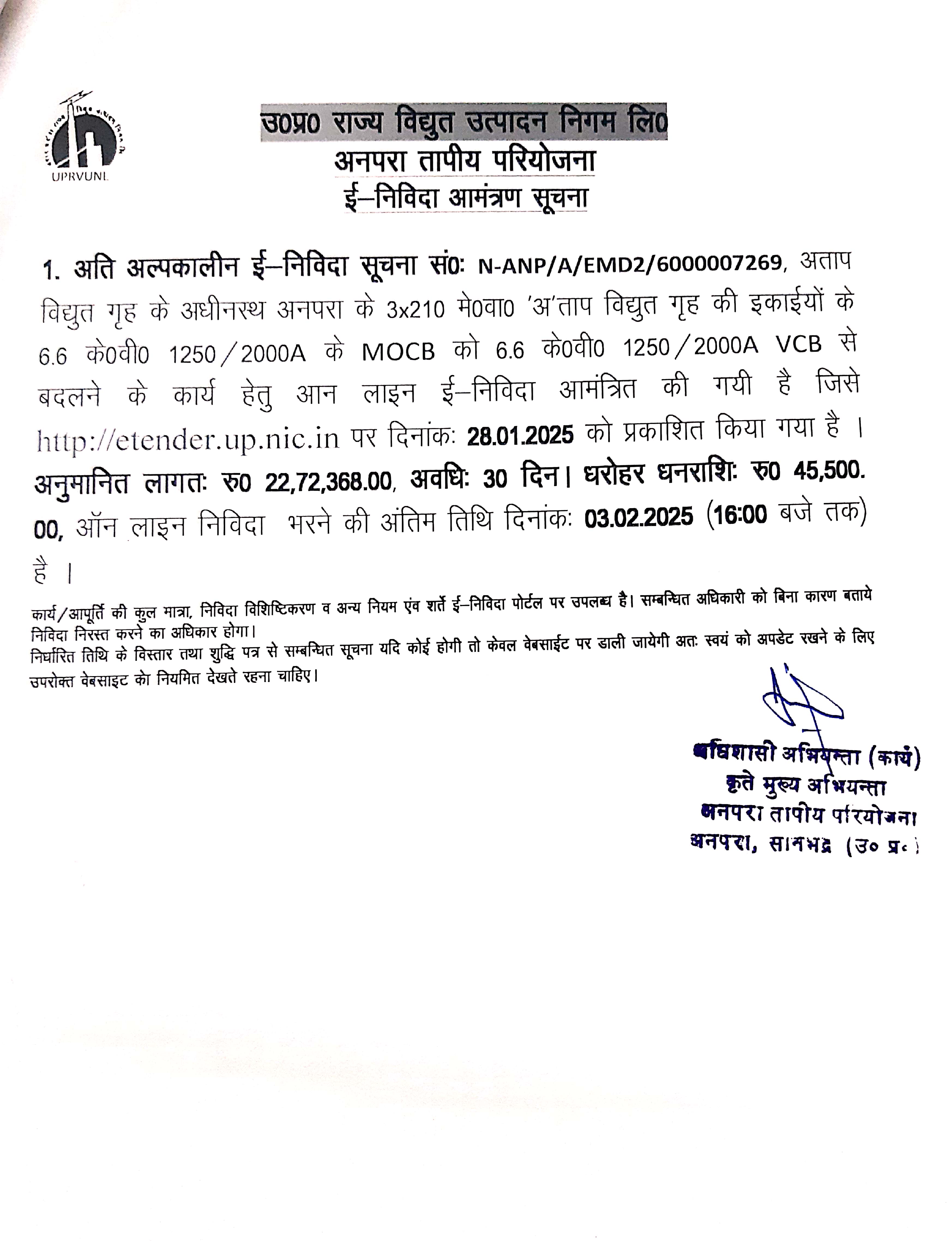 WORK OF ONE TO ONE REPLACEMENT 6.6 KV 1250/2000A MOCB WITH 6.6 KV 1250/2000A VCB OF 3X210 MW ATPS, ANPARA.